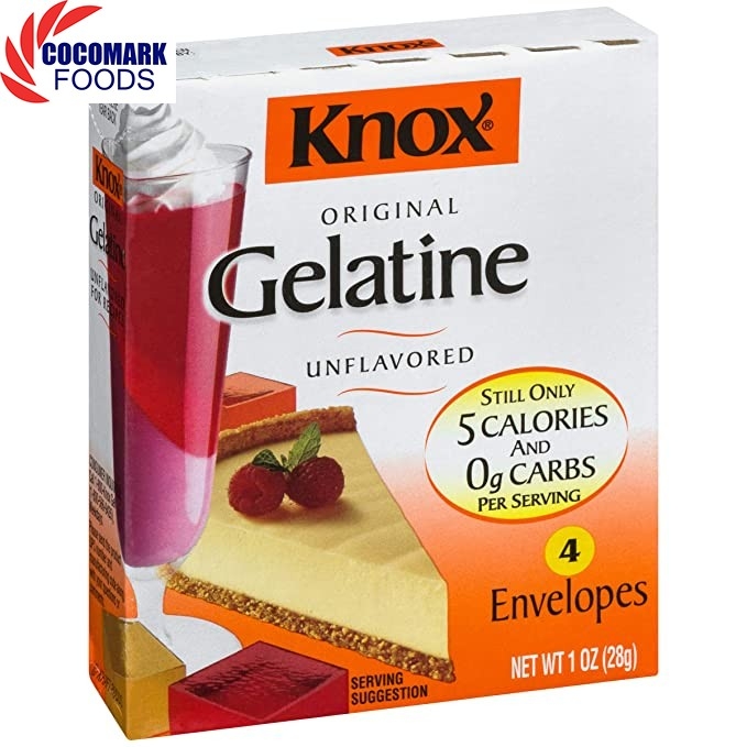 Bột gelatine Knox là một chế phẩm tạo ra từ chất collagen được chiết xuất từ da và xương của động vật. Nó được sử dụng rộng rãi trong ngành thực phẩm, dược phẩm và mỹ phẩm. Với tác dụng là chất tạo đông, đây là nguyên liệu cho các loại bánh Mousse, món thạch, tào phớ, cheesecake, tiramisu,...