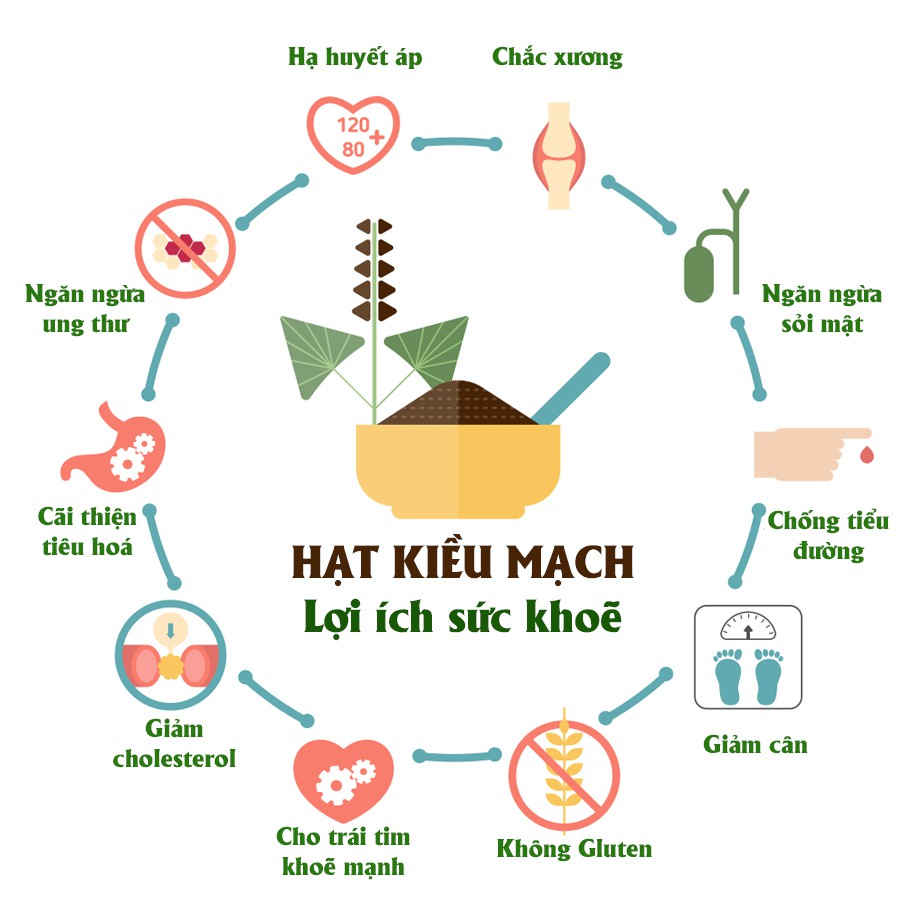 Hạt kiều mạch là loại hạt không chứa gluten, đồng thời là nguồn chất dinh dưỡng dồi dào. Kiều mạch thực sự không giống lúa mì, chúng không hoàn toàn không chứa gluten.Kiều mạch là loại thực vật Polygonaceae, không có mối liên quan đến các loại hạt chứa gluten như: lúa mì, lúa mạch và lúa mạch đen. chính vì vậy, hạt kiều mạch được sử dụng trong nhiều sản phẩm không gluten giúp tăng cường dinh dưỡng mà không gây dị ứng hoặc các vấn đề tiêu hóa