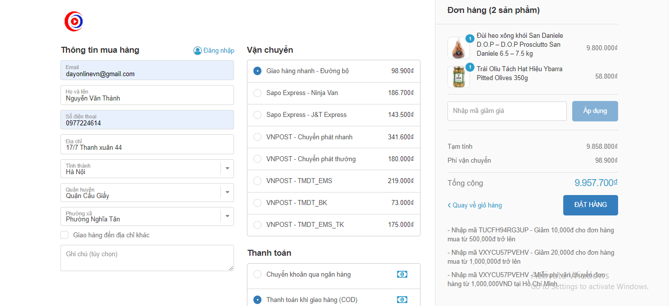 Đối tác vận chuyển & Phí vận chuyển: